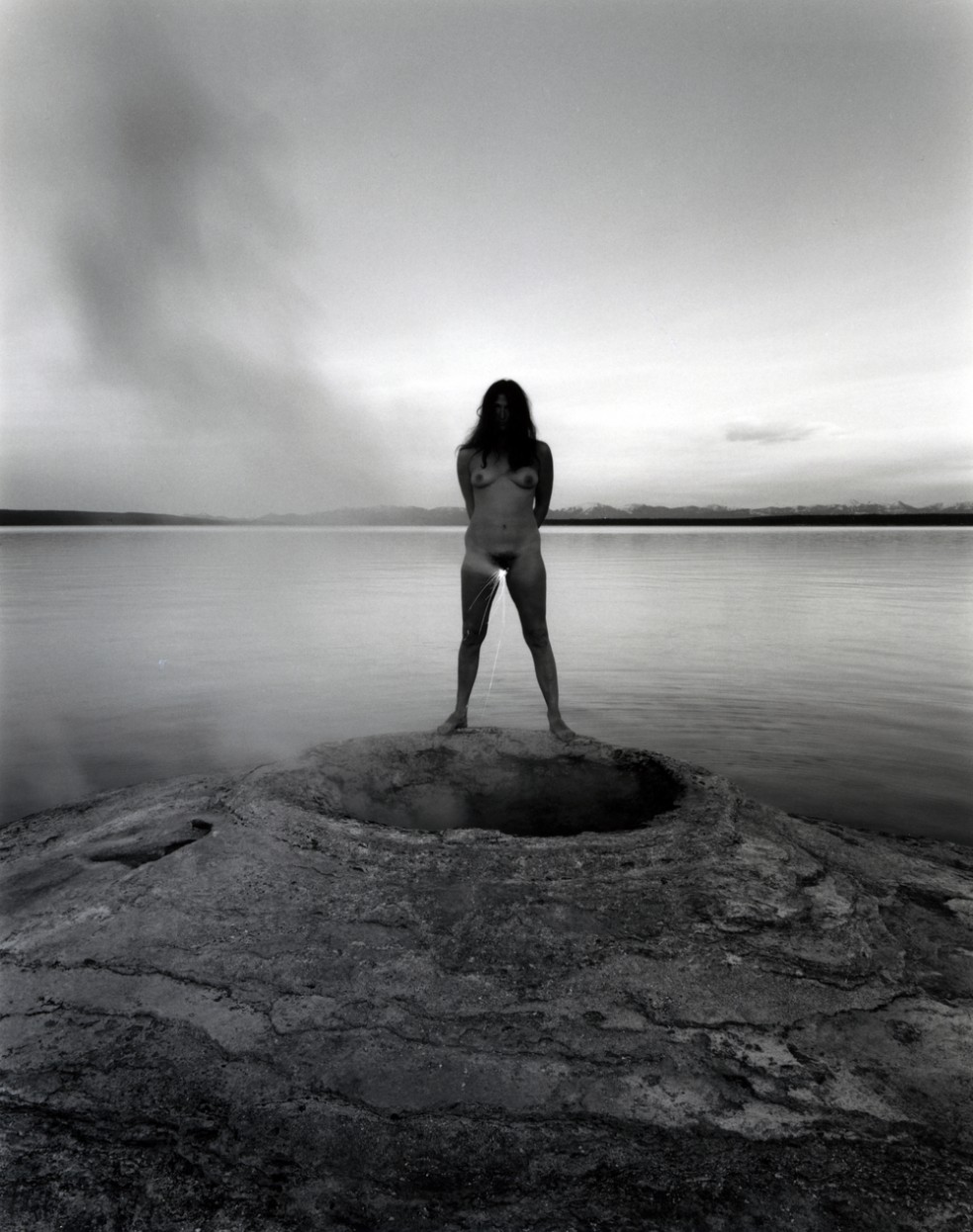 In 1981 Judy Dater stood at the edge of a crater, her naked body exposed, her legs astride. Behind her, what first looks like land turns out to be water, stretching in an uninterrupted, unstable expanse. Mountains wrap the distant skyline, the geologic inverse of a hole in the ground. Her stance should be precarious, located as she is where land becomes water, where the earth opens into a yawn. But Dater stands resolute, her posed limbs forming two stacked triangles connected at their points. Thin follicles of light travel between her thighs, punctuating the tip of her pubic hair, immaterial flickers from beyond.