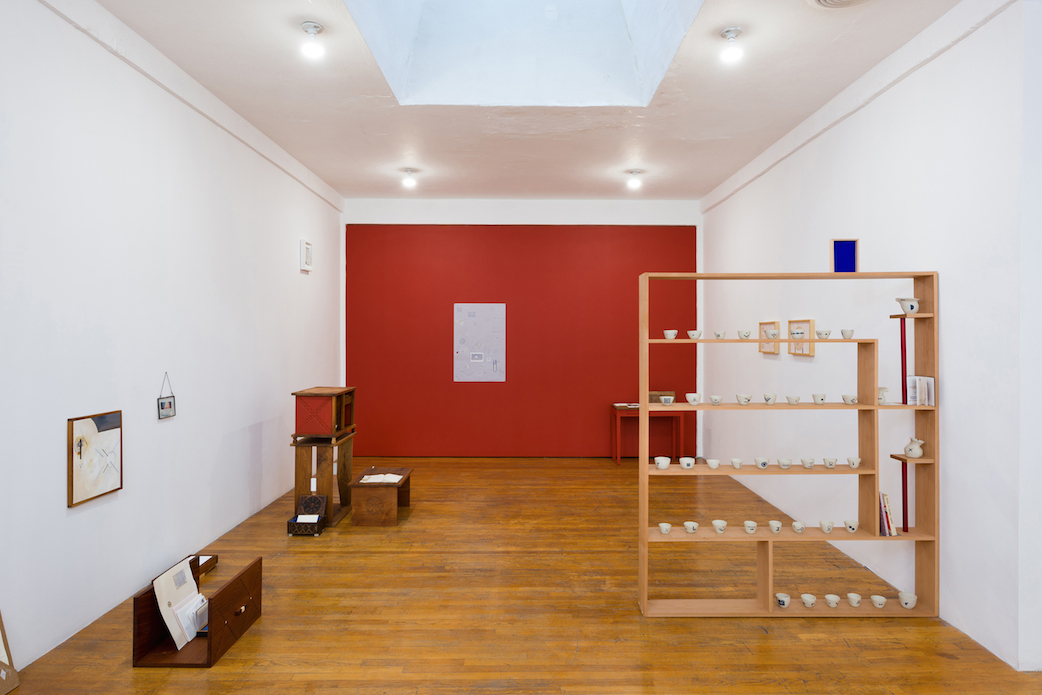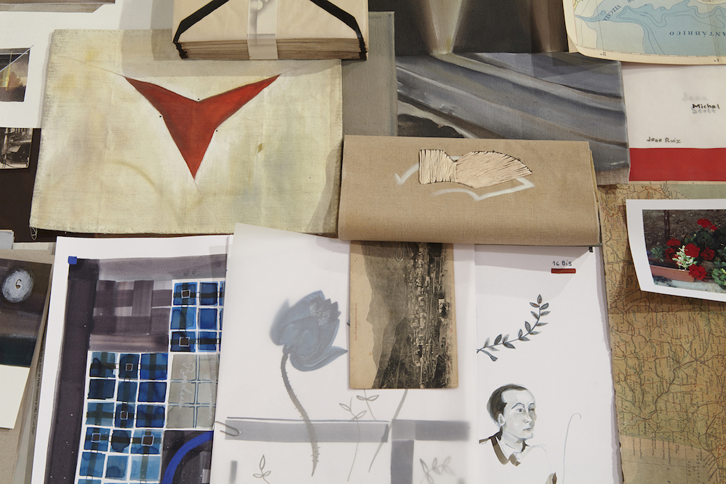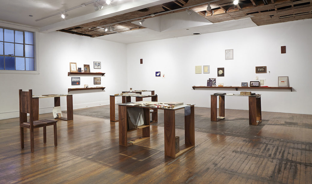 Patricia Fernandez. Points of Departure: Five Walks, 2012–15 (detail); glass and hand-carved walnut tables with drawings, paintings, watercolors, and text transcripts; each table 37 x 29 x 49 in. Commonwealth & Council, Los Angeles. Courtesy of the Artist and Commonwealth & Council. Photo: Heather Rasmussen. The transcripts are of a previously unwritten archive that records the path of the exiles from Spain into France after the Spanish Civil War.