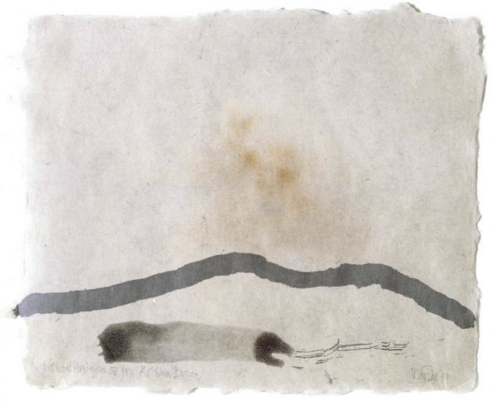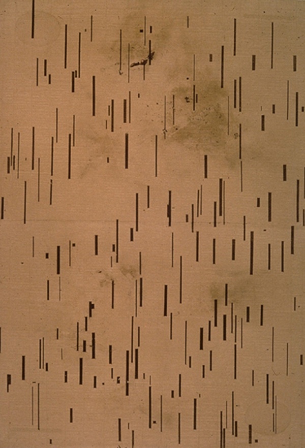 John Cage. Eninka 28, 1986; one in a series of fifty smoked and branded prints on gampi paper chine colle; 25 x 19 inches; published by Crown Point Press, San Francisco. Courtesy of Crown Point Press.