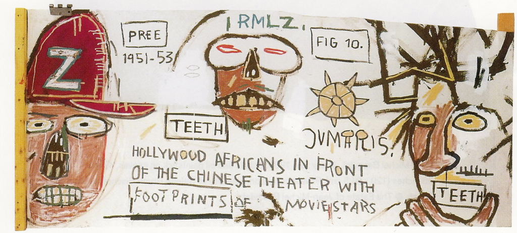 Jean-Michel Basquiat. Hollywood Africans in Front of the Chinese Theater with Footprints of Movie Stars, 1983; acrylic and oil paintstick on canvas mounted on wood supports; 35½ x 81½ in. Courtesy of the Estate of Jean-Michel Basquiat, New York © The Estate of Jean-Michel Basquiat.