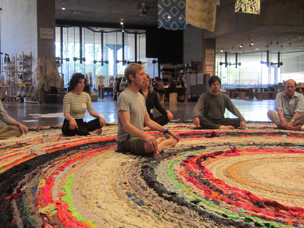 Yoga for Adjuncts: The Somatics of Human Capital workshop, Valuing Laboring in the Arts practicum, April 19, 2014, UC Berkeley Art Museum. Courtesy of the Arts Research Center, UC Berkeley. Photo: Michelle Ott.
