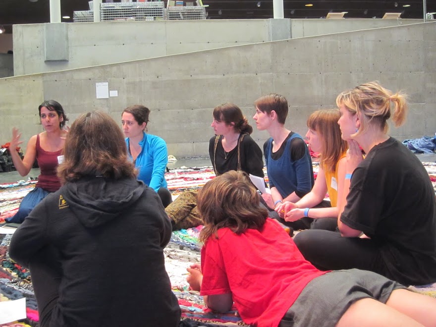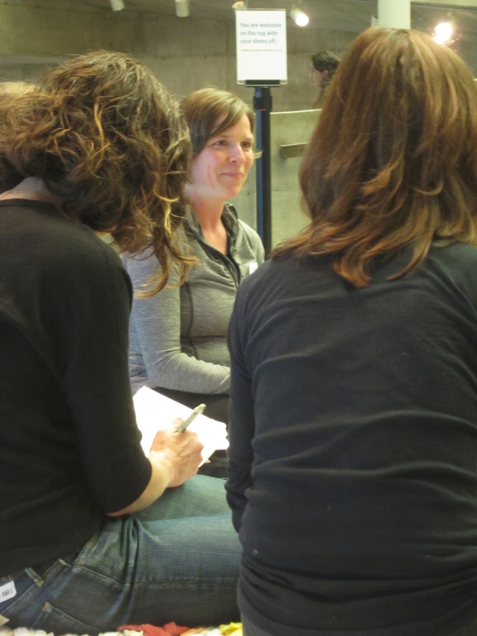 After our movements wound down under Wookey’s guidance, we made a “mind map” about words associated with “labor,” scrawling phrases on pieces of paper where we had just danced [fig. 4]. Then, seated on Fritz Haeg’s large braided rug, we debriefed about emotional exertion, interdependency, feminism, race, pleasure, and wellness [fig. 5]. Wookey joked, “I want to give a workshop about dancing in museums,” referring to the logistical problems faced by dancers who are increasingly invited to perform in museums, even as museums are unprepared for the realities of making sure their physical needs are met. (Surfaces ideal for pedestals and heavy foot traffic are punishing for bones and flesh.) Wookey talked about how she became the center of a controversy and an inadvertent activist in 2011, when she published her “Open Letter to Artists” regarding issues of unfair compensation during a performance by Marina Abramović at The Museum of Contemporary Art, Los Angeles (MOCA) gala. As the “Open Letter” plainly stated: