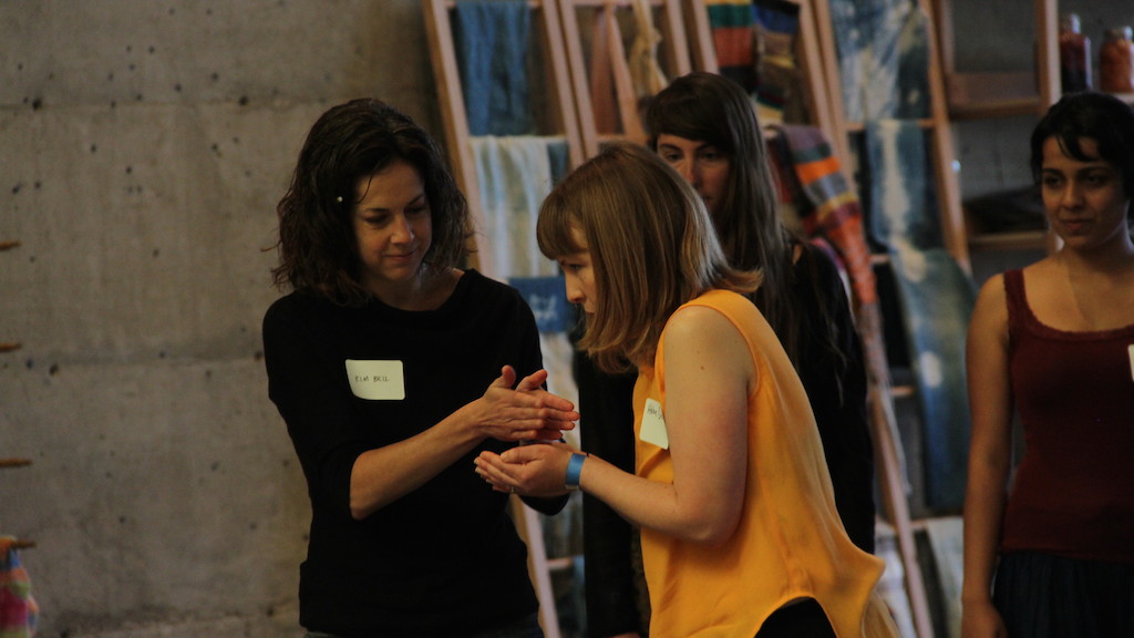 The workshop I attended, choreographer and dancer Sara Wookey’s “Collective Actions, Moving Thought,” explored gesture as a mode of nonverbal knowledge production. She asked us to designate a performance arena in the middle of a large gallery and then move to a series of prompts she asked us to meditate on using actions instead of words; one was the word “labor,” and gradually the clunkier, literal motions like jumping jacks or robotic jerks gave way to a fluid dynamic between and among bodies, as some came together to improvise and build engine-like human/machine hybrids [fig.1]. The more expected embodied responses—those that signaled diligence, exertion, endurance, and repetition, somewhat akin to the task-based dance of minimalism—were interspersed by those that performed acts of care, comfort, and tenderness (notably initiated by women) [fig. 2].