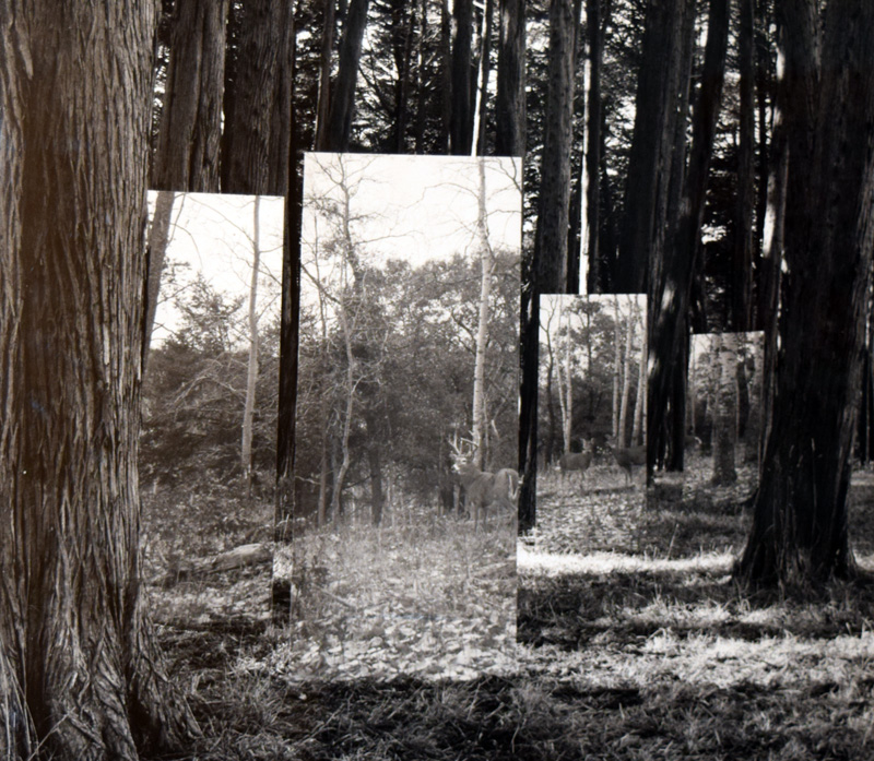 Like di Rosas’ impulse to record the region’s notable and emerging artists, many pieces in the permanent collection illustrate a broader human urge to record and contain the land. Exemplifying this is Robin Lasser’s Wall Mural Opens Up Any Room and Gives It That Greater Outdoor Feeling (1990–1991). Lasser’s black-and-white photograph portrays an intimate staggering of trees disrupted by four large, vertical mirrors. The mirrors show what is assumedly the opposite side of the grove, where similar trees are clustered and three deer are gathered, furtively addressing any onlookers. It’s hard to say if the deer are looking at us head-on through the glass of the mirror, or staring only at our backs. Nonetheless, the viewer is hard-pressed not to look on, through the glass that protects the photograph, and through the mirrors that depict the deer’s form. Where photographs are often used as means to grant viewers an infallible inside eye on the natural world, Lasser’s image only increases its mystery, and perhaps even humiliates our need to surveil. As viewers standing in the interior of a gallery, we are not only transported to the exterior without step, we are also, by way of the mirrors, provided eyes to see what is not in front of us. Like the quixotic title suggests, we are given “that greater outdoor feeling,” but in the process, the actual figure of the trees and animals between them have been flattened three times: by the mirror that was physically placed in the land, by the shutter of the camera and the image’s chemical impression on the film, and finally by its reproduction in the photographic print.