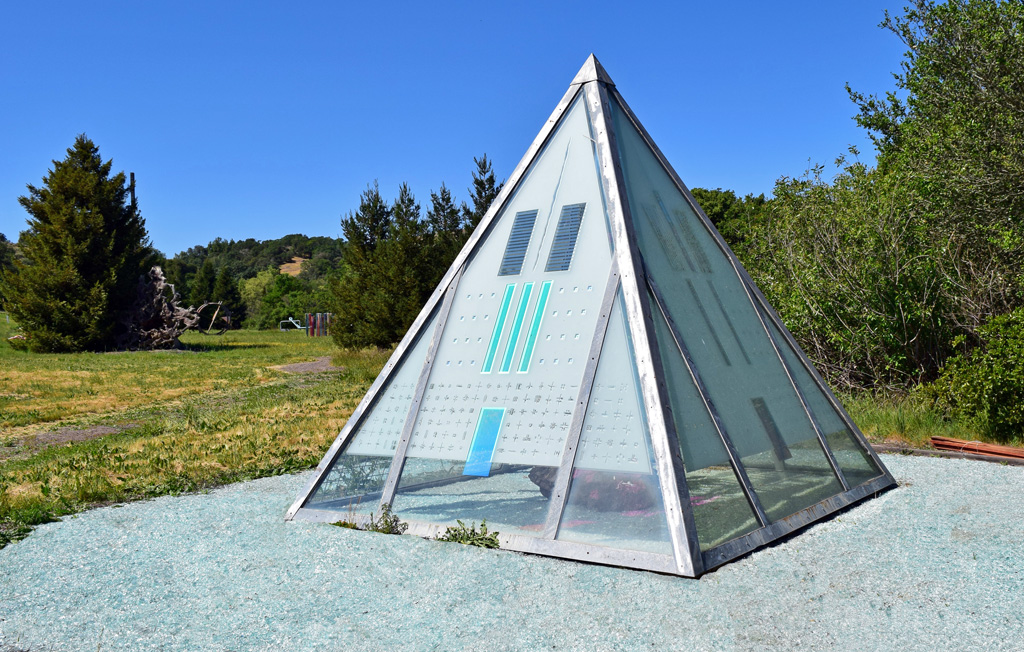 Gordon Huether’s steel-and-glass Di Rosa Pyramid (1997), which sits on the southeast end of the Sculpture Meadow, is another work where we witness land that has been tempered by our own structures. From afar, the pyramid’s four glass walls gleam, as do the countless pieces of pebble-size glass that create a circular ground cover below and around its confines. Three of four walls are scrolled with curious ciphers and rectangular fields of colored glass. The fourth wall is nondescript—it has neither cipher nor color. Its unmarked transparency instead reveals a large rock that has been cloistered within this futuristic atrium. Alone atop so much gleaming glass, the natural rock looks suddenly alien, its otherness made even more pronounced by the unkempt weeds ardently growing through the glass ground and encroaching on the sculpture with desperate urgency. Here in isolation, the rock is a slate for language, a stage for cast colors and dancing signs that vacillate with the movement of the sun.