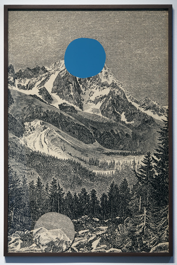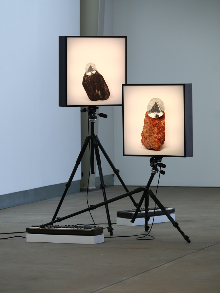 Back in the Gatehouse Gallery, Walker employs isolation to a similar end in the fallibility of intent with cutout surrogates of rocks and mountaintops that appear in multiple series in the artist’s exhibition. At times adhered directly onto a rock as in the series a paradox in distance (inverted) (2014) and the plight of inconsequence (2014), while at others held up between fingers, or on a large tongue depressor to align with a mountain’s distant silhouette, the paper stand-ins at once obstruct a true photographic depiction of the land formation and concurrently illuminate the artist’s own yearning. Walker’s is an earnest slapstick; the paper cutouts are as obvious a pretense as Walker could guard against, though they represent the only tools we have at our disposal to bring the land within our grasp. The roughly cut paper around each vignetted summit is human-made and -mobilized—crudely aware of its own limits but instructive nonetheless. Like language, these renderings may be far from sensorial perception, but they enable the relativity that produces communication.