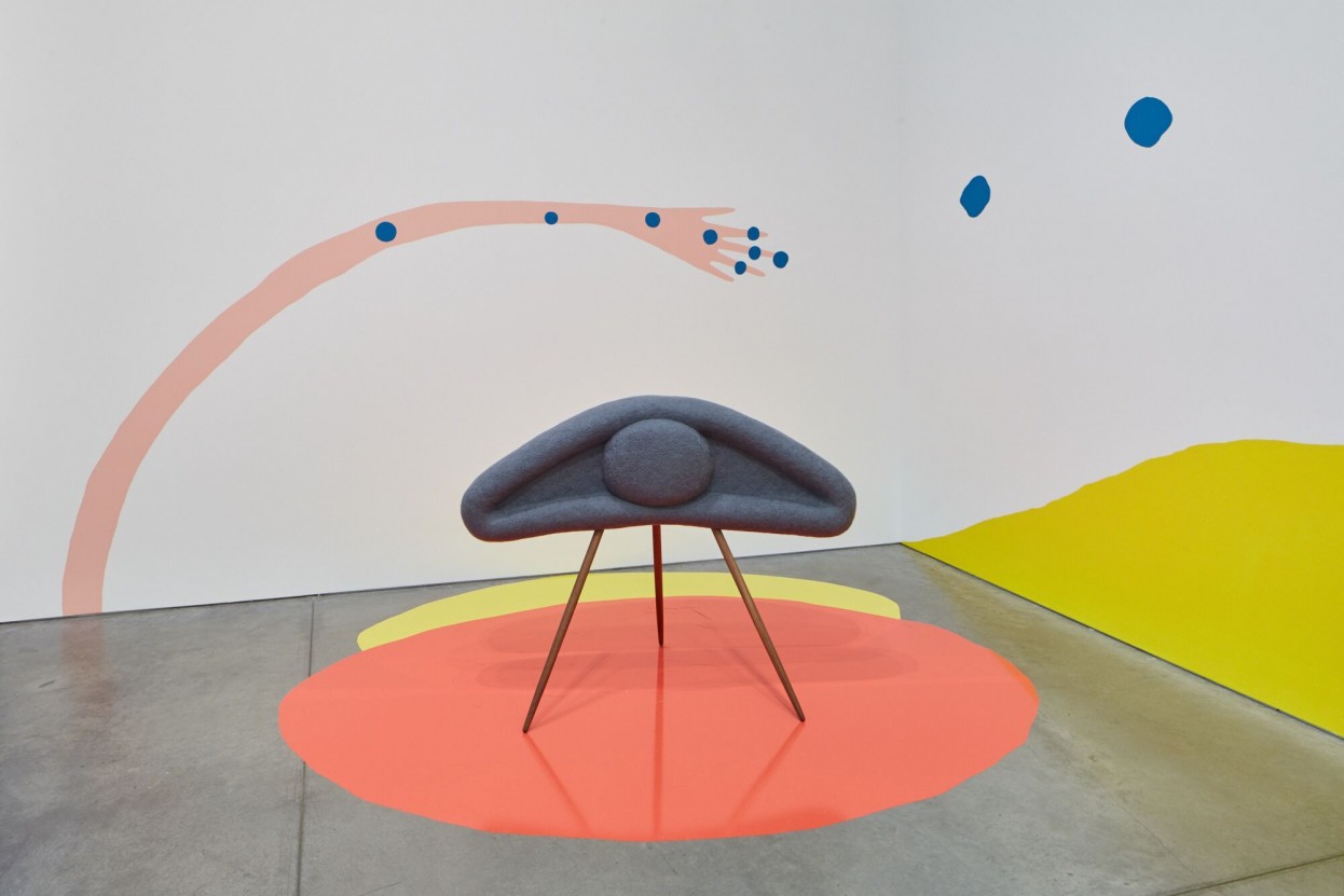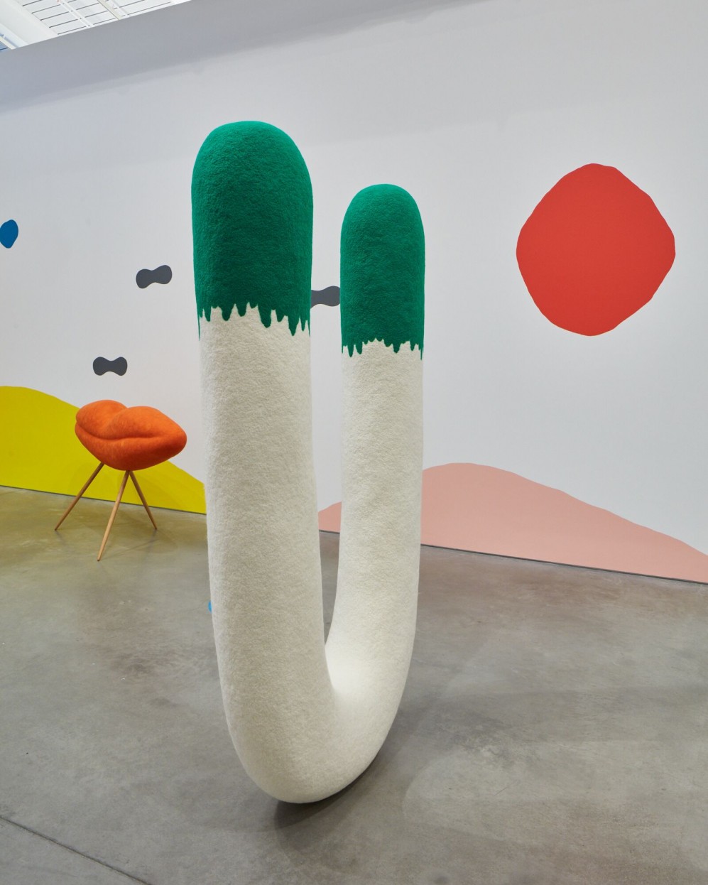 Walking into the two Bay Area shows by Masako Miki, Shapeshifters at CULT Aimee Friberg Exhibitions and MATRIX 273 at the Berkeley Art Museum, a viewer encounters large felt-covered soft sculptures in colors like turquoise, fuchsia, and bright yellow. It’s hard not to smile when confronted by these anthropomorphized figures, with their witty combinations of bulbous bodies and furniture-like, spindly legs. Yet there is more to the work than the immediate visual impact: a viewer is drawn toward, and in some cases through, the figures, taking in subtleties of narrative and meaning. Together, the two shows reveal a playful and poetic vision of cross-cultural mythology and human mutability.