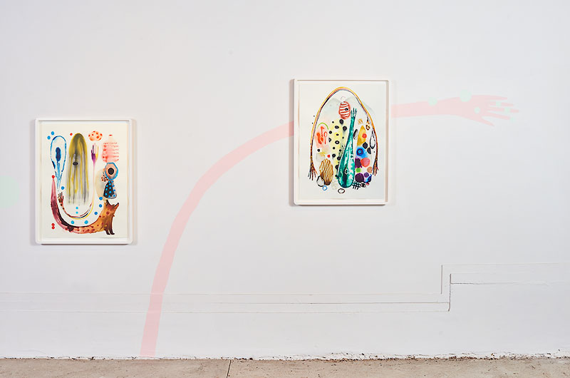 At CULT, the shape-shifters have come home to rest for the night. In the gallery, one wall is painted purple, and the exhibition features a softer color palette of lilac, periwinkle, and pale blue. Along with three soft sculptures, there are ink-and-watercolor drawings from the series Night Parade of One Hundred Demons (2018). “I wanted a nocturnal setting, sort of a poetic in-between, when it’s getting toward the night,” Miki said. “The general narrative is the shape-shifters are in a night procession, trying to get revenge on humans who took their tools and objects and abandoned them. At the end, they realize that’s not a good thing to do.” The illustrative ink-and-watercolor pieces especially contribute to the understanding of a folkloric narrative and offer a more intimate, contemplative experience than the three-dimensional works.