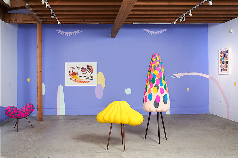 Miki, who was born in Osaka, Japan, came to California to get her BFA at Notre Dame De Namur University in Belmont before getting her MFA at San Jose State University. She has lived in California, mainly in Berkeley, for nearly two decades. Shinto traditions and concepts from Japan influence her work, and in these exhibits, she is representing yōkai, supernatural shape-shifters in Japanese folklore, beings that aren’t fixed as one thing or another. The kanji characters for yōkai (妖怪) mean something like "bewitching/attractive/calamity" paired with "apparition/mystery.” With their colors, softness, and originality, as well as their mysterious air of monsters or spirits, the yōkai do bewitch and attract.