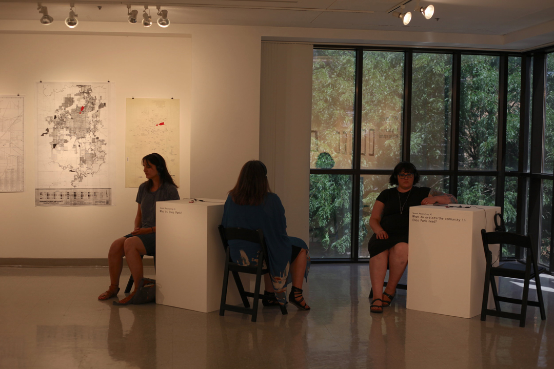 The itineraries of the individual walks, always chosen by the participants, were represented on maps, and the conversations recorded and compiled in two audio pieces: Who Is Enos Park? (2017) and What Do Artists/The Community in Enos Park Need? (2017). This documentation was brought back to the neighborhood in Kaemmerling’s solo exhibition, which was on view at University of Illinois Springfield Visual Arts Gallery from June 28 to July 28, 2017. The exhibition also included a group walk, where listening to one another (through the previously collected audio data) was the only request. In her reflection on 100 Days of Walk and Talk, the artist states, “If I just go on the one-on-one walks but I don’t share the conversations through composed sound recordings and don’t give the participants a chance to meet, then something is lost.”5
