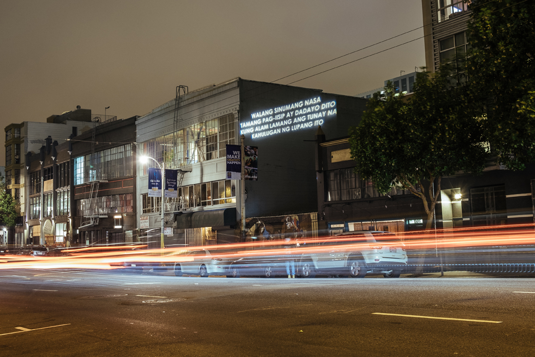 Jerome Reyes. Pharos (Still a Nice Neighborhood), 2016; ellipsoidal stage lights, light stands, projected text, outdoor building (3 language versions); 20 x 15 x 15 ft. in various locations South of Market area, San Francisco. Courtesy of the Artist. Photo: Jeremy Keith Villaluz.
