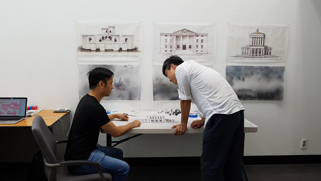 Jerome Reyes in studio with curator Park Soon Young at Seoul Museum of Art Residency.
