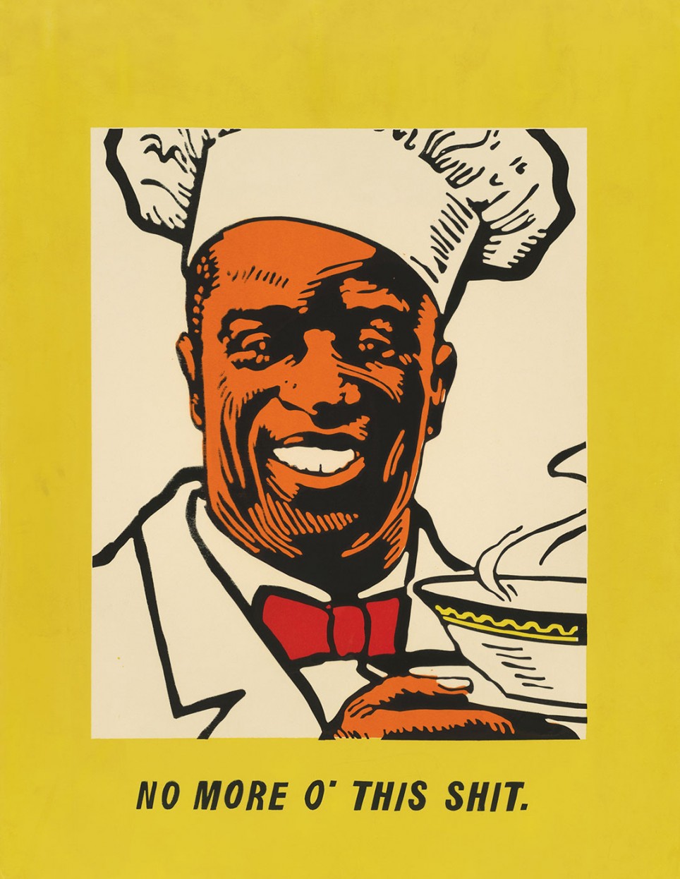 Having returned to painting by this time, García worked consistently with multi-panel images in order to tease out the political meanings and philosophical subtleties that art had to offer. Garcia’s work is fundamentally concerned with raising consciousness, but he rarely approaches this in an overt way. Even political posters such as No More O’ This Shit (1969), a rejoinder to the advertising image once featured on Cream of Wheat boxes that perpetuated a stereotype of Black servitude, is a complex play of language and image that undermines expectations and forces viewers and readers to figure out what exactly the problem is.