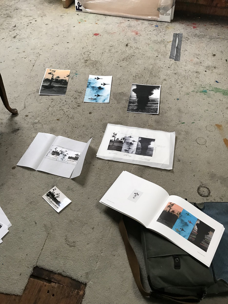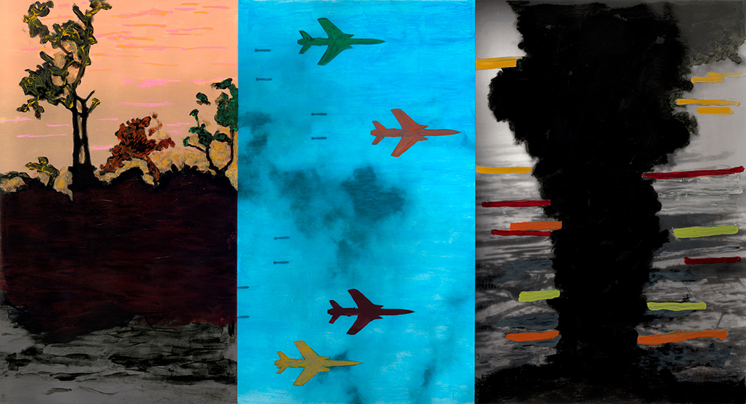 Rolling Thunder (2017) is a multi-panel painting that takes its name from the bombing campaign discussed above, and that gave its name to García’s current show. This work is an excellent example of the political and artistic fusion so fundamental to the artist’s work. It is also constructed from three different photographs: the first, an image from the Air Force base in Ubon; the second, an altered image of jets releasing their bombs; and the third, an image of an oil and lubrication production facility in Hanoi that was bombed by the U.S. As he described the process of this piece’s construction, he pulled out various drafts of all three images, spread them out across his studio floor, and explained the trial-and-error process that led to this particular composition.
