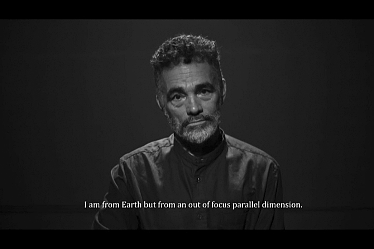 Viewers hear Murphy's voice but never see his face; the video is fixed on Ocula's face, with his dialogue appearing as subtitles, for he is able to communicate with Murphy telepathically. When asked where he is from—a question frequently posed to non-white people—Ocula explains that he is from an Atlantis-like place, on Earth, that had many races, brilliant artists, musicians, politicians, and philosophers. However, his home was invaded by Americans (as was Puerto Rico), and his people eventually disappeared from Earth to find refuge in an "out-of-focus parallel dimension."8 Murphy probes Ocula about his mission, asking him if he has come to infiltrate the United States. Like many immigrants who are tired of having to constantly explain themselves, Ocula simply states, "I don't have a mission," which Murphy refuses to accept over the course of the interrogation.9