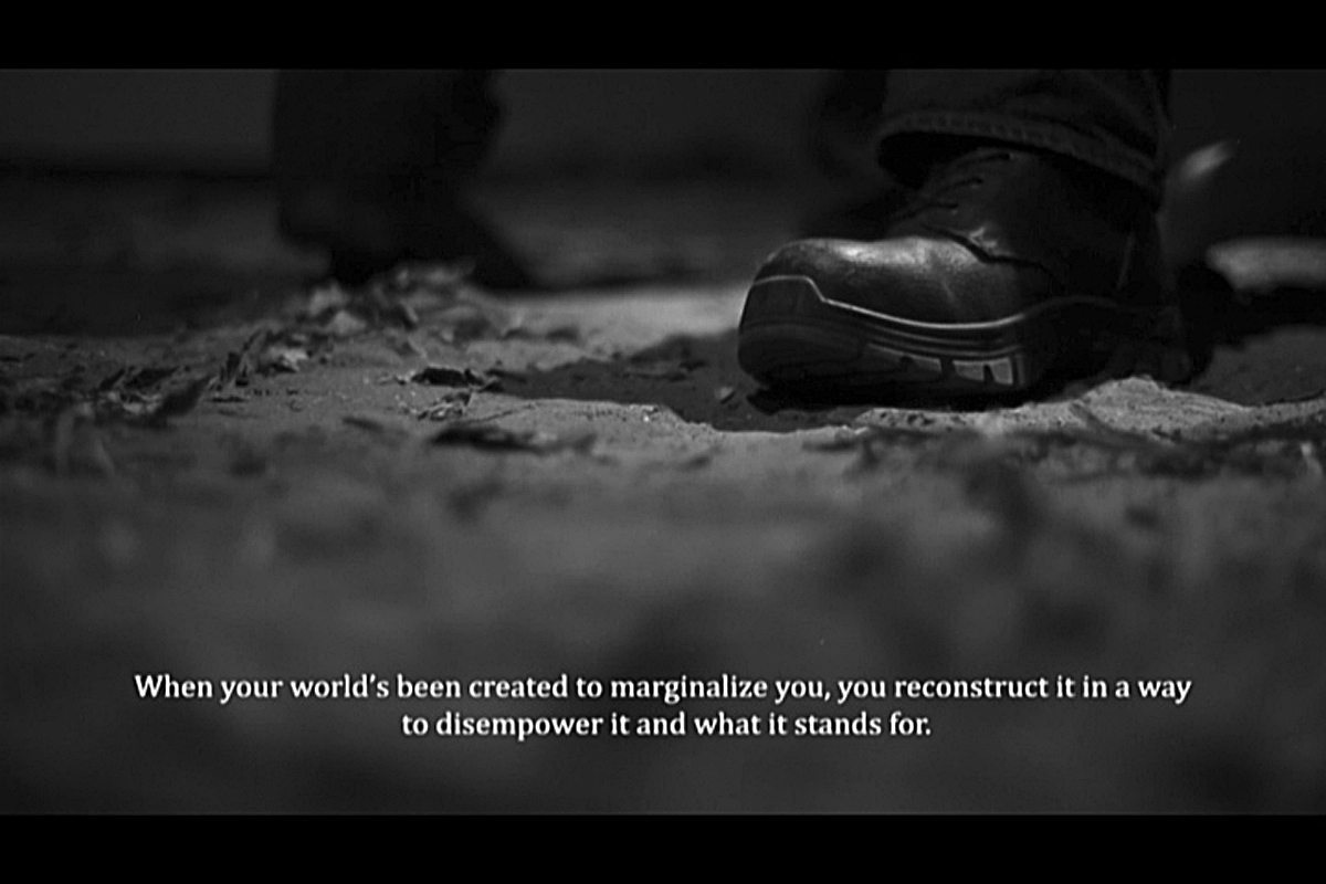 Of course, Asians are not the only targets of suspicion of otherness. Being both immigrants and dual citizens, Puerto Ricans possess a hybrid status, which arose from the island becoming an unincorporated territory of the United States after the Spanish–American War (1898). In a series of U.S. Supreme Court decisions that began in 1901 (known as the Insular Cases), the U.S. defined Puerto Ricans as an "alien race" and "foreign in a domestic sense," and in 1917, the court granted U.S. citizenship to Puerto Ricans.5 In La Coconaut Interrogation (2017), the Nuyorican (New York Puerto Rican) artist ADÁL explores this state of hybridity and the suspicion that it triggers.6 The sparse black-and-white video chronicles the interrogation of Agápetu Ocula, a Puerto Rican vision scientist, after NASA found him on the moon. Today we know that undocumented aliens are detained after Immigration and Customs Enforcement (ICE) raids; in ADÁL's video, NASA's Air Intelligence Center for Interrogation quarantines and detains Ocula, keeping him in a dark space and under maximum security, supposedly for the safety and comfort of the "alien." Because Ocula appears human, with plain and reserved gestures, Special Agent Wayne Murphy remarks, "You look like us—an earthling, that is."7 Murphy's dialogue points to the power of appearances and the division of us as either American or human.