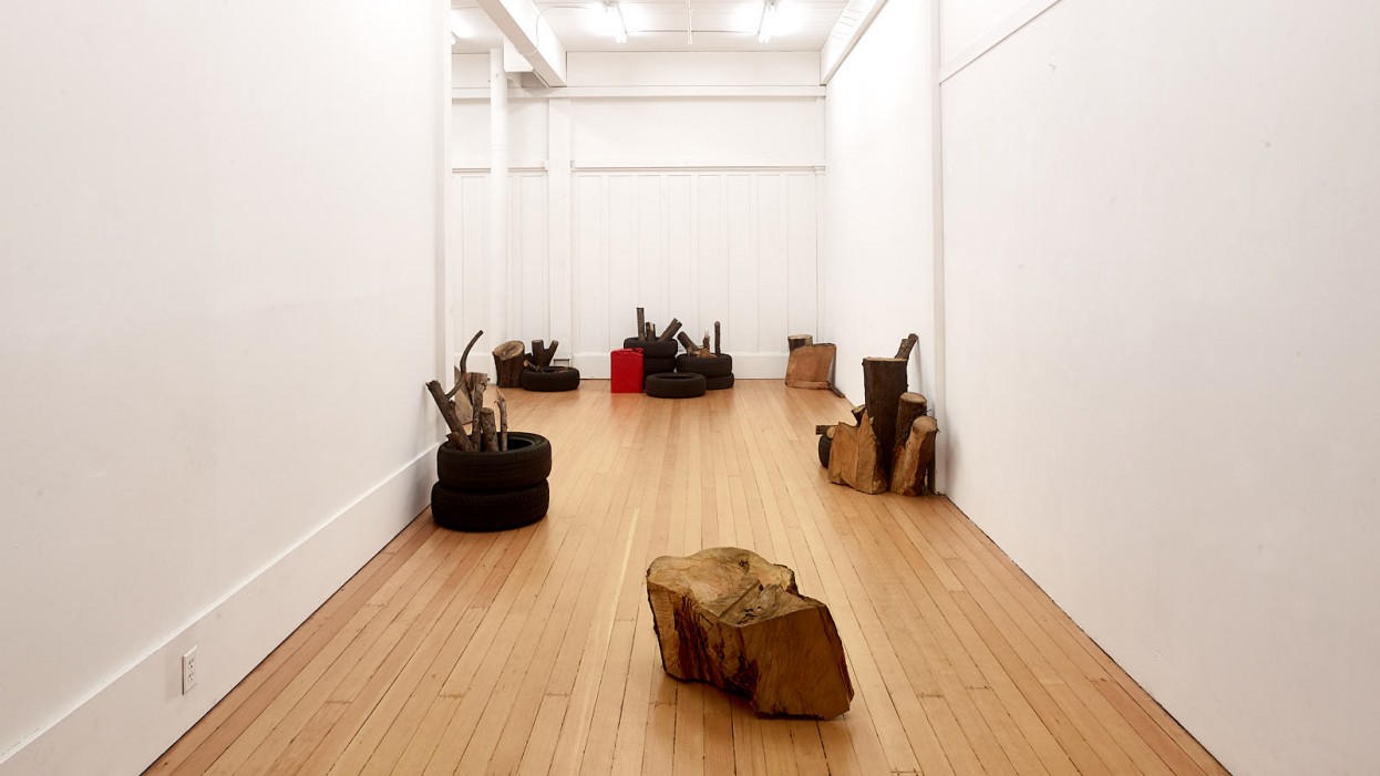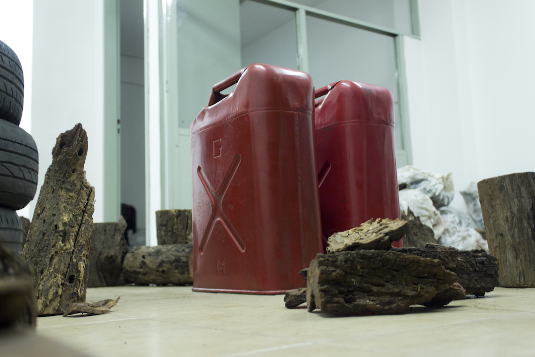 Pyre’s wood, rubber, and gas also evoke colonialism’s continuing destruction through the practice of mono-cropping and a dominating industrial-commercial focus. These products compose some of the worst of resource extraction’s cruel exploitation of this planet, and, in Pyre, they distill physically nauseating conditions into the art piece by connotation, augmented by the unnaturally bright lights and white walls of the gallery space. The faint whiffs of worn rubber and rough-cut wood slabs are overwhelmed by the imagined odor of gasoline in its sealed metal jerricans along with the specter of the horrific effects if these materials were to be ignited to unleash fire as a hyper-efficient instrument of destruction. The elements conspicuously lacking in the piece are human bodies – both victims and perpetrators. If viewers are the only human bodies present, then do they become stand-ins for either, or both?