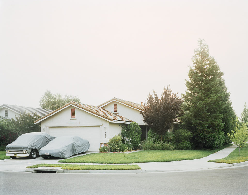 Covered Cars (2008) is a much more banal scene, without the bucolic beauty of Rafting. Two covered cars are parked in the driveway of a typical, red tile-roofed suburban home flanked by a sterile, manicured lawn. The air is dense and smoky, and, like in so many suburbs, there are few signs of human life. The ghostly, vacant scene is the most familiar to me in the series—by the looks of it, I could have grown up in this neighborhood—yet there is no accompanying sense of ease. In fact, the image makes me anxious, as this post-industrial Levittown aesthetic was cause for my own desertion of suburbia.