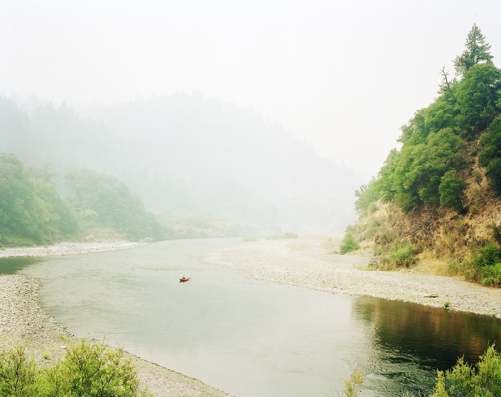 In Rafting (2009), a lone red raft, dwarfed by surrounding trees, drifts down a river canyon. Smoke from a wildfire consumes the hills in the background. In another context, it might not be clear that a wildfire is nearby; we could be witnessing early-morning ocean fog winding its way upstream. The tenderness and ambiguity of the scene softens the blow; I can hardly hear the mobilization of California’s largest evacuation ever, even though I know it’s just beyond the ridge.