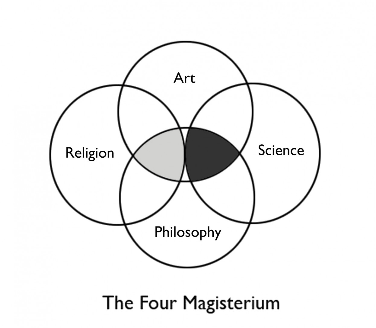 In 2008, I created a Venn diagram to illustrate an essay I wrote about the work of the artist Matthew Day Jackson. The diagram, pictured here, depicts the relationship of science, art, religion, and philosophy. At their best, each of these spheres of inquiry awakens or invigorates our capacity for wonder and provides a means of engaging our astonishing existence. Each sphere makes use of a different approach, but they are fundamentally complementary. When I created the graphic, I had in mind the scientist and historian Stephen Jay Gould’s concept of nonoverlapping magisteria, an attempt to resolve the conflict between science and religion by describing them as separate-but-equal spheres of human inquiry. Gould insisted the spheres of science and religion are nonoverlapping because good science trades in facts to explain material phenomena whereas religion traffics in the unverifiable and the unobservable. Where science seeks to demystify, and to build on each subsequent revelation to learn more, religion aims to make the mundane sacred, to make the ordinary extraordinary. As my diagram shows, art and philosophy share traits with both science and religion and, while I agree with Gould that science and religion don’t overlap, it’s important to note that all four magisteria are realms of the question (i.e., although the methodologies of genuine scientists, philosophers, artists, and religious thinkers may differ, all are preoccupied with interrogating our world).8 Contrary to the caricature of the scientist as the white-coated statistician ready to provide any and all answers, science is like a matryoshka doll, a series of questions nested within questions. The same is true of exemplary art, philosophy, and religion: any answer arrived at is merely a stage for another question.9
