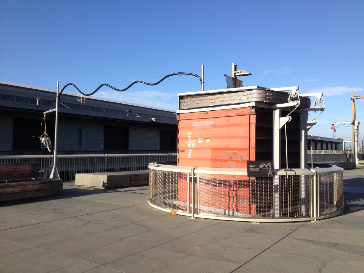 The Exploratorium’s culture embraces a good experiment. Many artists relish the chance to work in our shop with experienced designers and engineers who can help them realize new possibilities in their work. Our current Over the Water project, Bosun’s Bass (2015), a monumental, tide-activated sound work, is a great example of this; the artist Tim Hawkinson worked with a team of engineers and designers to develop the work. A shipping container, pitched vertically in a hole in the deck of the Exploratorium’s outside plaza, is connected to the bellows from an articulated Muni bus to create a two-stage bellows, similar to what one would find in a pipe organ. As the tide rises up into the shipping container, the chamber fills with air and the bellows expands. Air from the bellows flows through a tube to a nearby bicycle, the tread of which is inscribed with patterns that triggers a series of valves and levers to produce twenty-one bosun’s calls (a pipe or whistle used on naval ships by a boatswain). This experiment with the physics of sound produces haunting tones that recall San Francisco’s maritime past. Hawkinson’s process of developing Bosun’s Bass compelled us to ask: How did the boatswain’s call develop into an international maritime language? Can wakes in the Bay generate as much air pressure as the rise and fall of the tide? How does the mouth move when we trill?