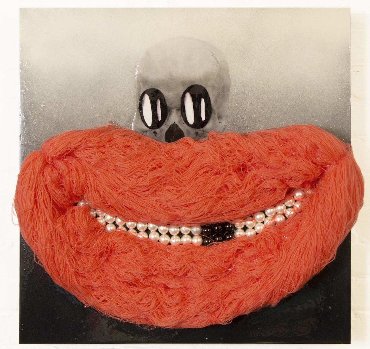 Marika Kandelaki. …the abyss will also gaze into you, 2015; yarn, spray paint, acrylic, epoxy resin, printed paper on panel; 24 x 24 in. Courtesy of the Artist.