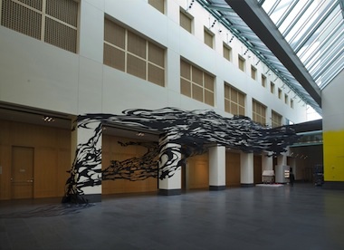 Sun K. Kwak. Untying Space, 2012; site-specific installation of black masking tape and mixed media; approx. 60 x 24 ft. Courtesy of the Artist and the Asian Art Museum, San Francisco.