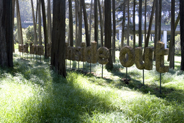 Driving from Park Presidio Boulevard onto the Golden Gate Bridge, for example, passersby can peer out their car windows and glimpse the camouflaged aphoristic word sculptures that Philippe Becker Design filled with nesting material for the American robin in the work Winged Wisdom (2010). Phrases like “nest from the inside out” are appropriately sized poetic fragments that prompt a reconsideration of the surrounding built environment. While many other habitats in this show fail to function as homes or resources for animals, instead playing on formal and conceptual figure-ground relationships operating within an object-based proprietary economy, the larger conversations about place and prototypes for sustainable living merit its selection for Best Environmental Arts Initiative.