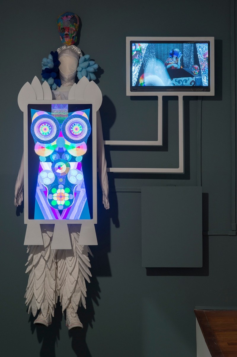Saya Woolfalk. ChimaTEK: Hybridization Machine, 2013; natural and synthetic fabric, foam mannequin, painted steel, converse shoes, plastic skull, glass and plastic beads, two television monitors, electronics; 74 wide x 82 high. Courtesy of the Artist.
