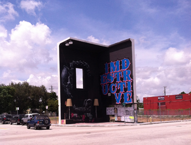 I encountered The Living Room (2001) for the first time while I was heading to Locust Projects from the Wynwood Arts District and looking for parking. I imagine this is how a lot of people find it—on the way to someplace else. Located at the edge of the officially named Design District, the large-scale installation is attached to nothing, though its form alludes to the shape of the building it was previously attached to. The oversize seating and lamps still exist amidst a slew of wheat-pasted posters. A window stands out against the dark paint and graffiti tags. A contemporary ruin, the nearly two-story-high structure is still impressive, beckoning the viewer toward the empty lot where it sits.