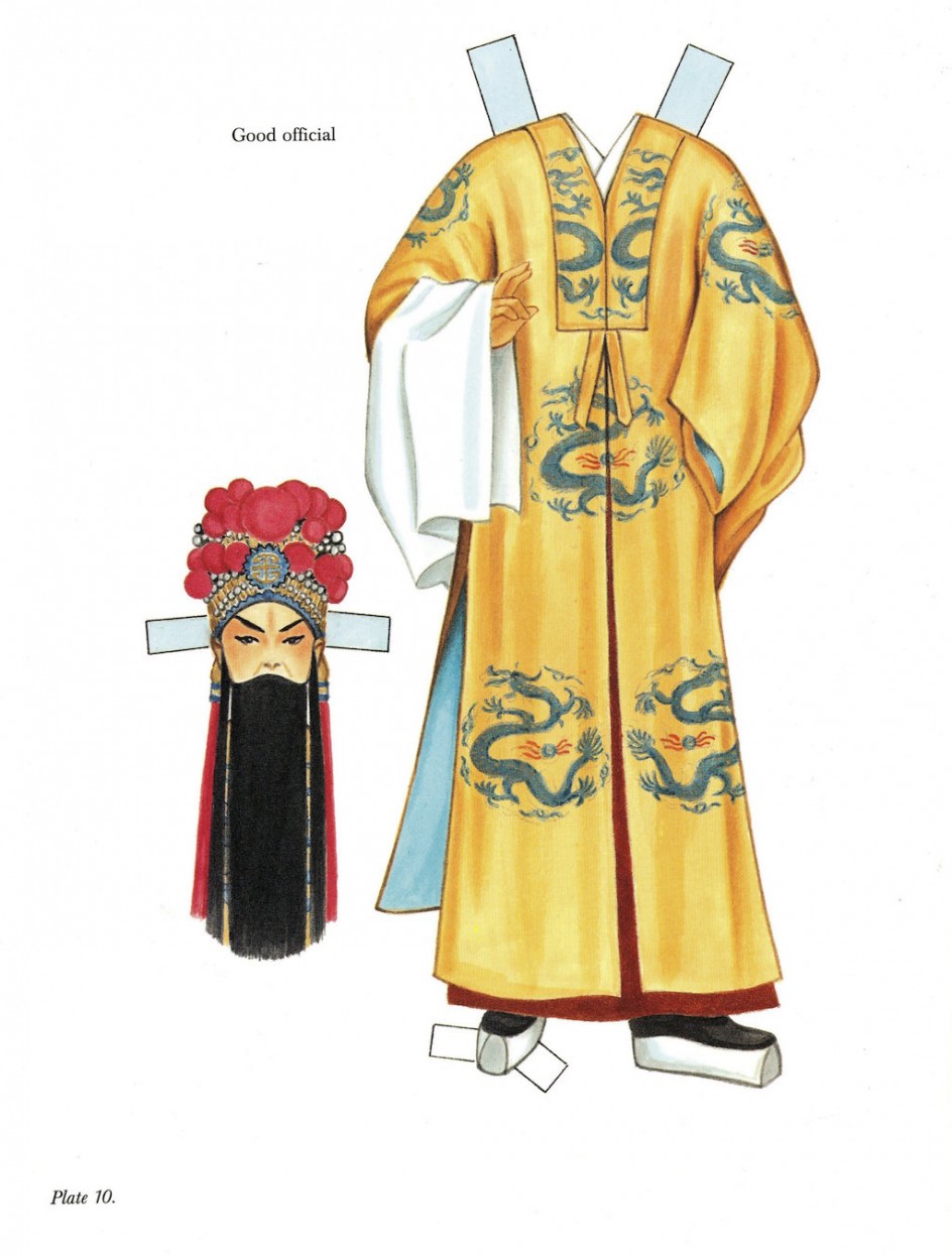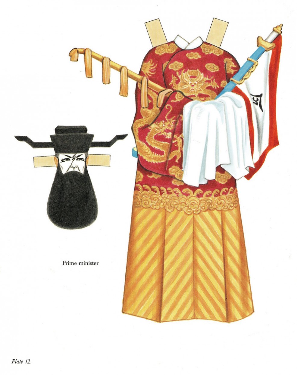 The symbols of dragons and a long beard again appear in “Prime Minister, Plate 12,” but their meaning is different. The minister’s face is painted black and white; the dashes beside his eyes mimic the shape of his two-tiered black headdress. His outward expression is unsympathetic. Red and gold on the robe again signify strength and power. But Sun does not mention his virtue in the title: he is not the “Good Prime Minister.” His arms are crossed and his hands are hidden beneath long sleeves. He holds two scepters, one with a flag. All these subtle details indicate his character: the viewer should be wary of his power within a larger plot.