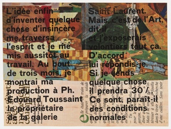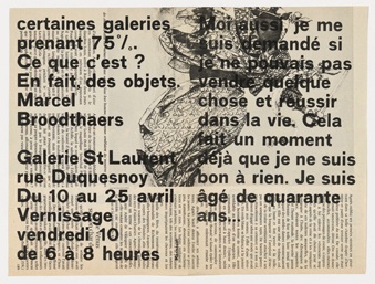 In a related turn, Marcel Broodthaers’s professional transition in 1964 from poet to artist was likewise motivated by pecuniary insight. On the occasion of his first exhibition at Galerie Saint-Laurent in Brussels, Broodthaers sent his now-notorious invitation, announcing: