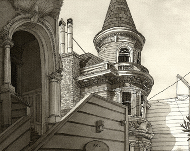The monograph Everything Is Its Own Reward (City Lights Publishers)—the artist and writer Paul Madonna’s continuation of his popular San Francisco Chronicle weekly series, All Over Coffee—actually includes images of other cities (Buenos Aires, Rome, Paris), but it initially feels like San Francisco’s book, both in focus and in spirit. Even though Madonna’s ink-and-wash drawings depict a city without people or cars (and it is not typical that one can paint a successful portrait of a place without some attention to its people), his empty streets are nevertheless rich with signs of life and psychic resonance. Madonna captures the kind of serenity with which San Francisco seems perpetually blessed and that other cosmopolitan cities only evince in the very early morning. This strange illusory relief from the usual urban neuroses is one reason that people continue to fall in love with San Francisco when they visit and that compels them to stay, even after the illusion has been recognized as such.