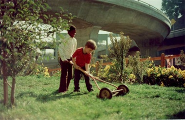 Bonnie Ora Sherk. Boys mow lawn on The Farm (View south toward Army Street Freeway Interchange), 1976 from CROSSROADS COMMUNITY (The Farm), 1974-1980. Courtesy ofA Living Library.