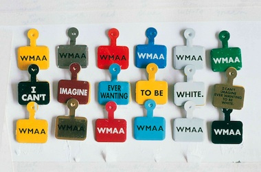 Martinez: [The Whitney doesn’t] use them anymore, but [at that time] they had these little metal tags that you would wear to show you paid admission. Each day has a different color. I proposed to Elisabeth that we break up the sentence, “I can’t imagine ever wanting to be white,” into a number of different phrases and print those on the tags. It’s structurally based on Ferdinand de Saussure’s theory about the organization of language and how you can change meaning in language by changing the organization of language. It is an organization of an idea that is passive-aggressive. Visitors to the museum became part of the work because they had to wear one portion of the phrase. Identity is a construction, right? The same way gender is a construction or sexuality is a construction. So here, identity is in motion; it’s constantly shifting and moving based on that particular set of words and based on the individual. Everyone who visited the museum got to perform in this construction that was changing depending on who they were with or what phrase they were wearing. But the phrase does test the limits of a civil society. [Many] didn’t like the fact that I was changing the mechanism of the gaze or identity and race. A number of people just didn’t appreciate it.