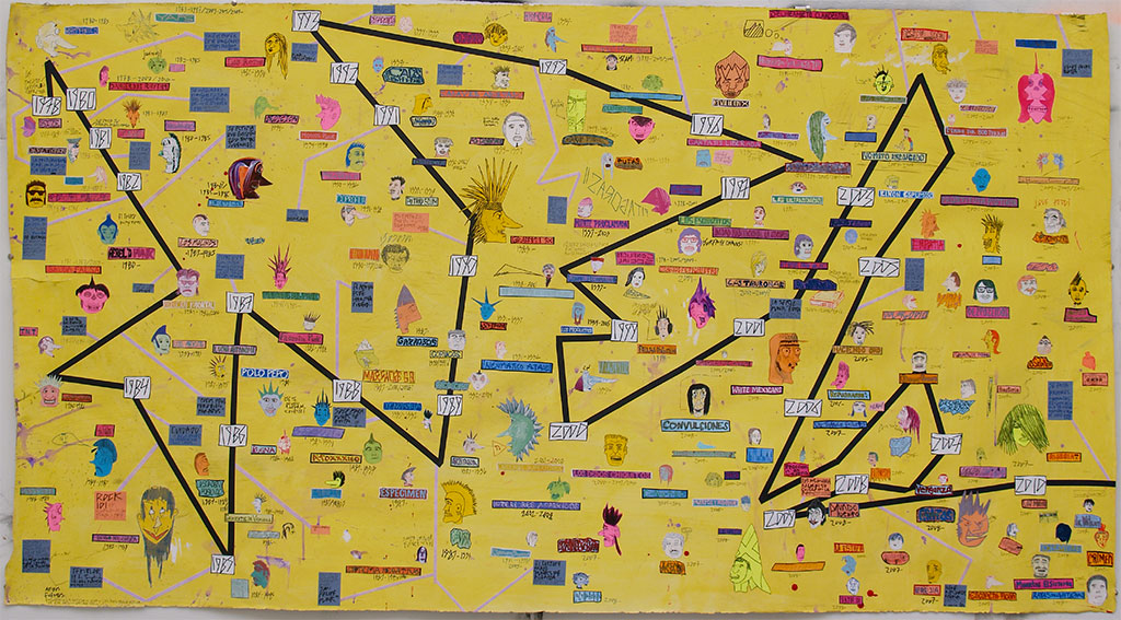 September 10, 2015Juan Luna-Avin is like an encyclopedia of punk rock in Mexico City. I first learned of him as the baby-faced author of a giant painted map, a jagged sand-colored timeline of punk bands in Mexico City. The painting was in a show at Southern Exposure; each band was represented by a miniature cartoon portrait with the beginning and end dates of the band. In 2011, I met Luna-Avin and asked him to propose a work for a show I was curating called Bruce Conner and the Primal Scene of Punk Rock. His idea was a semi-abstract diorama full of pipes and conduits, inspired by the clever adaptations of Mexican bands from impoverished neighborhoods: they would invade businesses after hours and steal electricity from the generators to power the shows—the ultimate DIY. The interview below combines two email exchanges that followed Luna-Avin’s reference to the creation of punk rock in Mexico City. —Steven Wolf
