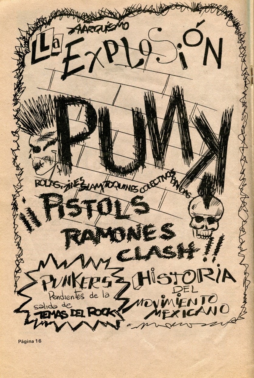 JLA: Photocopy machines were uncommon so making flyers was pricey. Visual references for early Mexican punk flyers and zines mostly came from the US West Coast movement and the Spanish movement. They were characterized by aggressive hand-drawn images and text and anarcho-punk idealism.