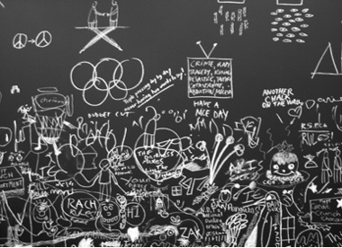 Romania-born and -based artist Dan Perjovschi's medium is site-specific drawing…. His “canvas,” like that of a graffiti artist (whose “baroque” and territory-marking methods he nevertheless firmly distinguishes from his own), is the nearest wall, preferably topographically marginalized or, in his own words, “left over.” And his utensils are nothing more than those easily accessible in a grade-school classroom: chalk, marker, pencil, or pen….The artistic voice he developed as his native land began to turn away from Ceauşescu-style communism toward its 2007 inclusion in the EU is a voice that retains the traces of its passage—the madness of political austerity and censorship having been transmuted into a method of simplicity and candor, at once humorous and pungently critical.