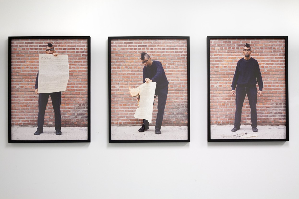 Dread Scott. Burning the U.S. Constitution, 2011; three pigment prints; 26 x 20 in. each. Courtesy of the Artist.
