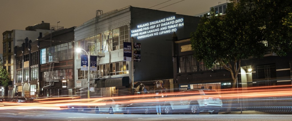 Jerome Reyes. Pharos (Still a Nice Neighborhood), 2016; ellipsoidal stage lights, light stands, projected text, outdoor building (3 language versions); 20 x 15 x 15 ft. in various locations South of Market area, San Francisco. Courtesy of the Artist. Photo: Jeremy Keith Villaluz.