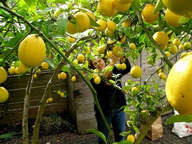 Susanne Cockrell picks lemons in the backyard of a home in Oakland, California, in January 2006 as part of Temescal Amity Works (2004–2007). Courtesy of the Artists.