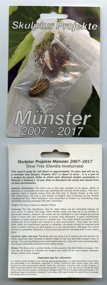 The promotional materials for the collaboration also proposed meticulous care, despite being a peripheral part of the project. Deller packaged seeds of a Dove tree in tiny recyclable plastic bags. A Dove tree seed resembles a walnut, and the resulting tree flowers once every ten years. Just behind the plastic-bagged seed is an image of its flower. On the back are precise instructions on how to grow it for the desired results, and a lyrical description of the tree: “its flowers flutter in the wind like white doves... Plant biologists have described its flowers as resembling large butterflies hovering amongst the tree’s branches.” People attending Skulptur Projekte could purchase Dove tree seeds, plant them, and after ten years of careful gardening, be reminded of the upcoming 2017 event when the trees bloom.