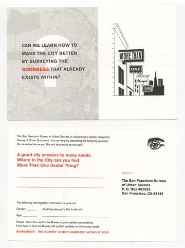 9. Jeannene Przyblyski and Mitche Manitou for the The San Francisco Bureau of Urban Secrets, The Deeply Subjective Survey of Urban Goodness (2004-present), postcard.