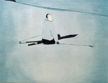 Starting around 1994, Tuymans’ output began to acquire a radiant quality; these paintings don't depict light so much as project it outwards. In the 1997 Der Architekt (The Architect), a skier—often cited as Albert Speer, Hitler's architect—has fallen down. He sits with skis splayed in the middle of the picture, which is gradated in a shimmering icy blue. Tuymans remarked that the painting is blue because he derived the image from a documentary he saw. It is a "transmitted image"; Tuymans is actually depicting the blue TV-screen light instead of natural light reflected from the snow. Of course, without the artist's divulgence, this differentiation wouldn't have been at all apparent. These sorts of revelations and insights defined much of the morning's tour. Tuymans provided us with many contextual details about the work's inception: interesting, charming, anecdotal details about what was going on in his head when he was inspired to make this painting or that painting, what idea each painting "represented."
