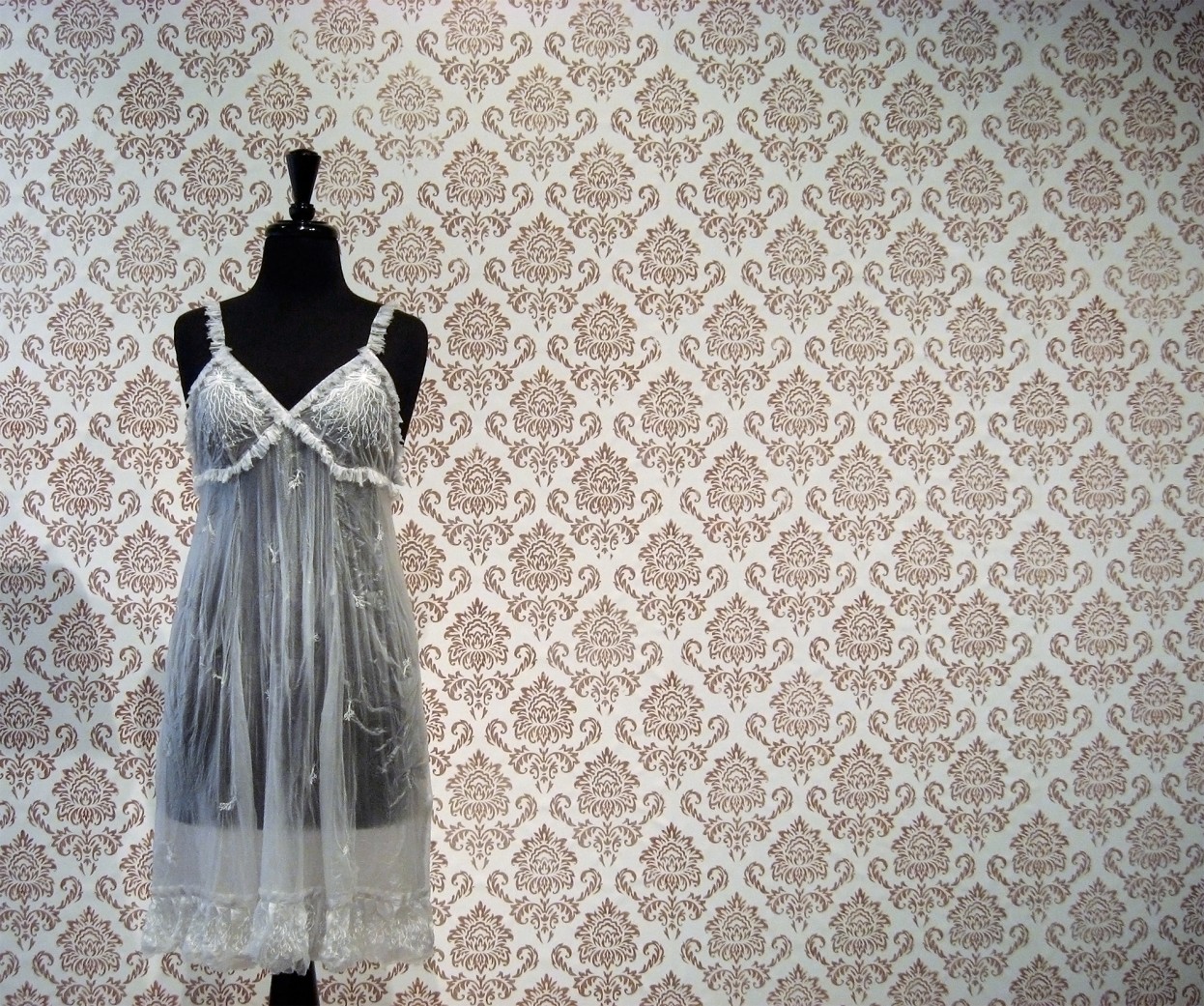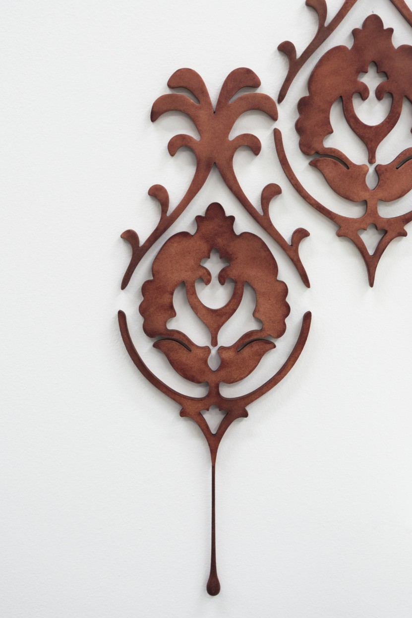 Laura Splan. Wallpaper pictured with Negligee (Slipping Into the Skin of Another), 2008; site-specific installation at the Museum of Contemporary Craft, Portland, OR; hand-block-printed wallpaper with blood; 86 x 96 in.