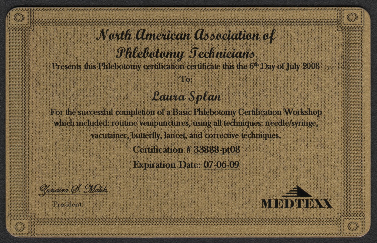 Phlebotomy certification card, issued July 2008.