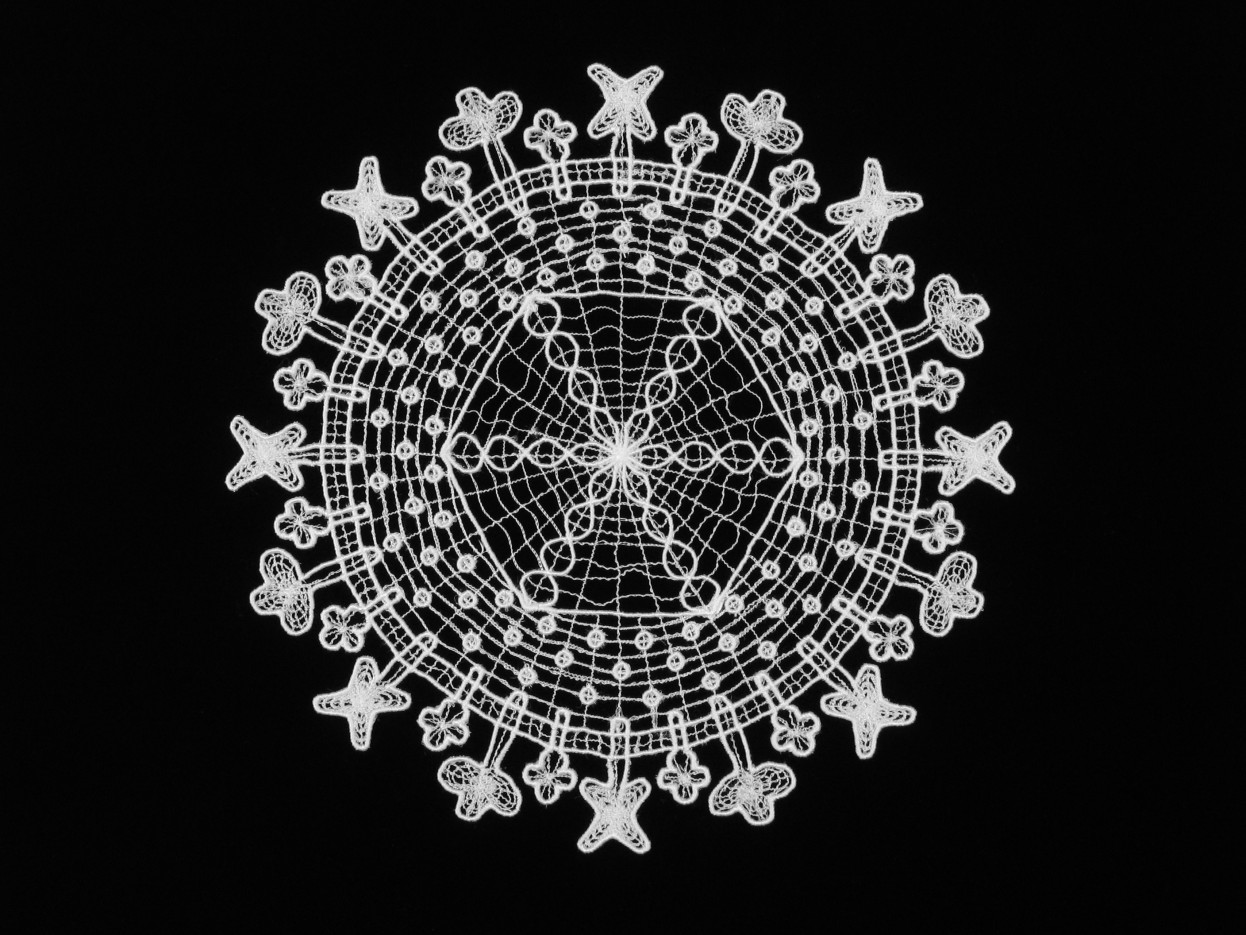 In Doilies (2004), I rendered a series of five different corona viruses (SARS, HIV, herpes, influenza, hepadnavirus) in the form of radial lace doilies. I researched the structure of the viruses at the same time that I was teaching myself digital embroidery techniques. In a twist on the needlework tradition of the schoolgirl sampler, I was equally invested in honoring the traditional conventions of the doily as I was to studying and accurately depicting the structure of the viruses. Such aesthetic and technical concerns do not always align, and that is when as an artist I have to make decisions about prioritizing art over science or science over art. These decisions are often agonizing, and, if done well, the winner is unclear.