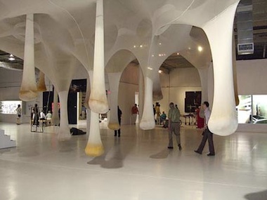 Image: Ernesto Neto. É, ô Bicho!, 2001; lycra tulle, polyamide tubes, hooks, turmeric, black pepper, and cloves; dimensions variable; installation view, the Margulies Collection at the Warehouse, Miami. Courtesy of the Martin Z. Margulies Collection, Miami. Exterior, the Margulies Collection at the Warehouse, Miami.
