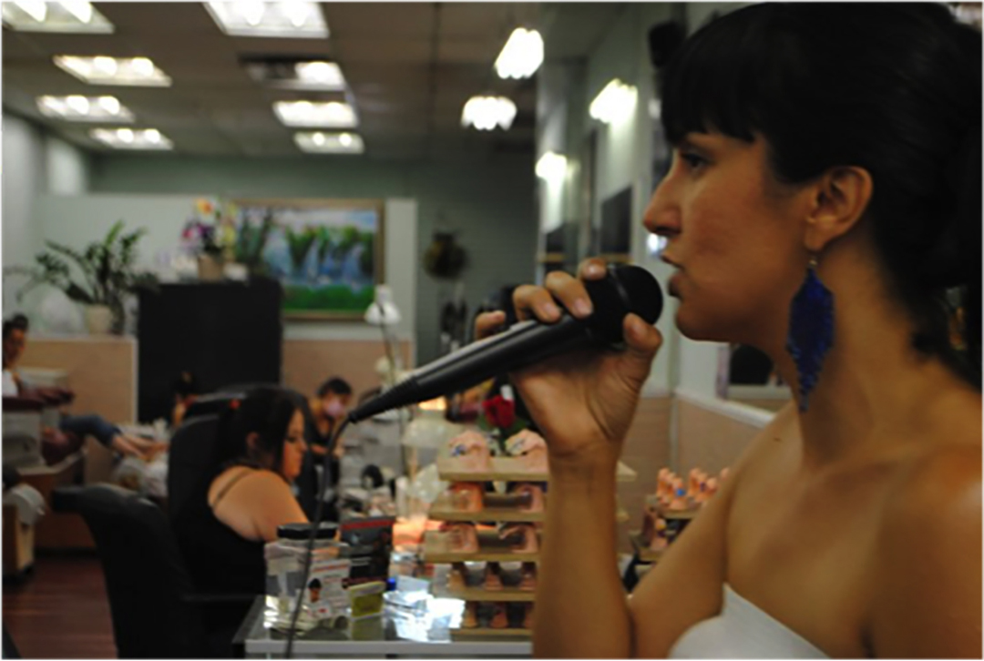 Mujeres de Maíz. Felicia "Fe" Montes performing at nail salon in East L.A. as part of Poetry Procession, 2011. Courtesy of Mujeres de Maiz.