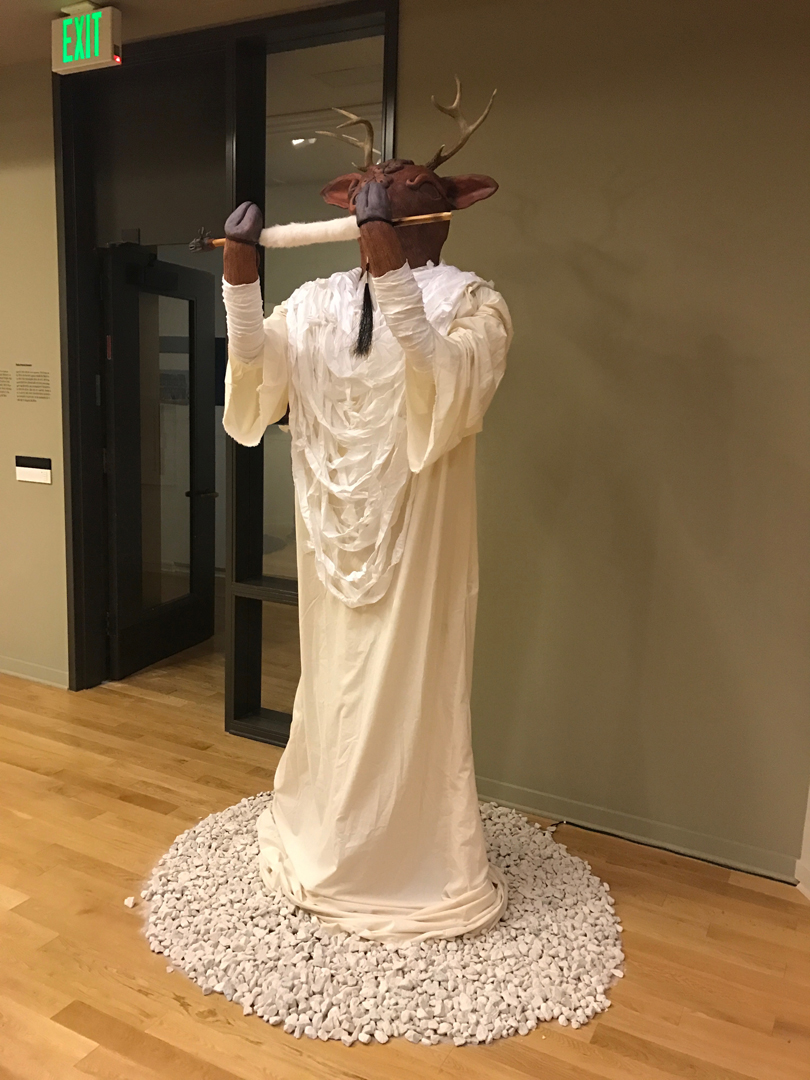 On another level, Aparicio’s social engagement through objects recovers pre-colonial knowledges that have been lost through settler-colonialism. The naguales exert political consciousness and resistance to the physical and spiritual genocide of indigeneity (for human and more-than-human forces such as animals, earth, ancestors, etc.). One example is the Bear nagual, which stands in the East with yellow cloth wrapped around its neck and arms and carries a drum made of buck hide. The East is the direction from which the sun rises; it represents birth and all beginnings and guides through its light, thus invoking understanding and wisdom. In combining the East with the drum, Aparicio is referencing the heartbeat of Mother Earth as well as the heartbeat of the people, and bringing the spirit world and Creator into the exhibition space. Aparicio’s work therefore offers an opening to a sacred, ceremonial space that aligns itself with Indigenous calls to change our relationship with the Earth. In one of its most recent attacks, the Trump administration has moved to open up protected federal lands in Bears Ears National Monument to mining, logging, drilling, and other forms of extraction. Now more than ever, the praxis of Indigenous and Chicanx artists is needed if we are to begin creating a sustainable world. The work enacted in the NoDAPL movement at Standing Rock, La declaración universal de los derechos de la Madre Tierra (The Law of the Rights of Mother Earth) in Bolivia, and the Idle No More movement in Canada, as well as by artists such as Aparicio, show that Indigenous cosmovisions can be carried out in social and political work without removing the relations of mind, body, and spirit.